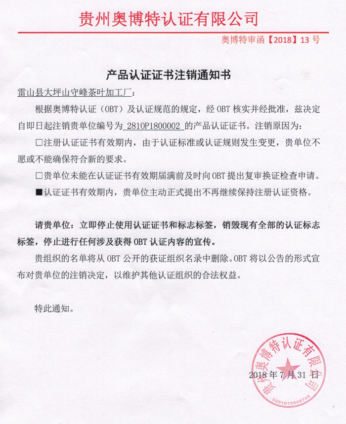 注銷雷山縣大坪山守峰茶葉加工廠產(chǎn)品認(rèn)證證書通知