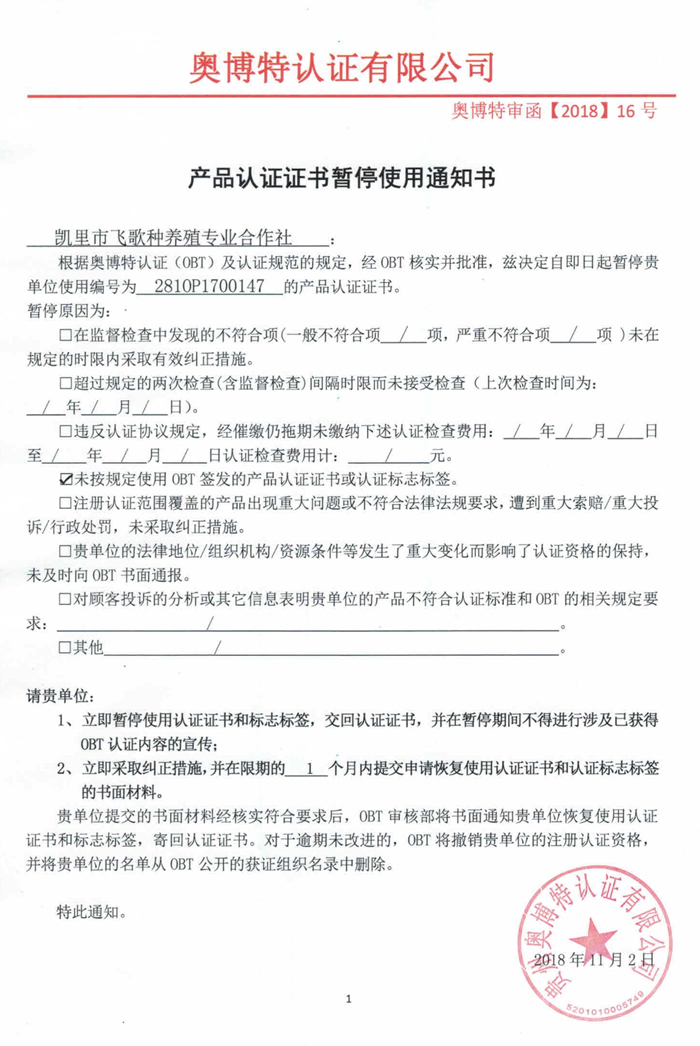 暫停凱里市飛歌種養(yǎng)殖專業(yè)合作社產品認證證書使用通知書