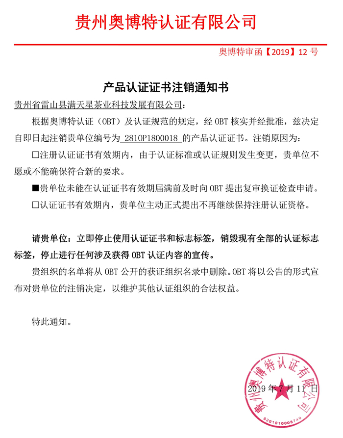 注銷(xiāo)貴州省雷山縣滿(mǎn)天星茶業(yè)科技發(fā)展有限公司產(chǎn)品認(rèn)證證書(shū)