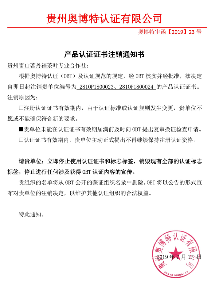 注銷貴州雷山茗丹福茶葉專業合作社產品認證證書通知