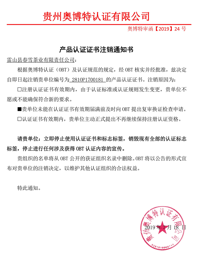 注銷雷山縣春雪茶業有限責任公司產品認證證書通知