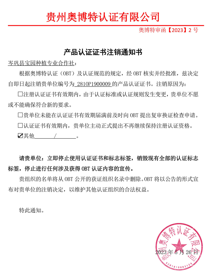 注銷(xiāo)岑鞏縣寶園種植專(zhuān)業(yè)合作社產(chǎn)品認(rèn)證證書(shū)通知