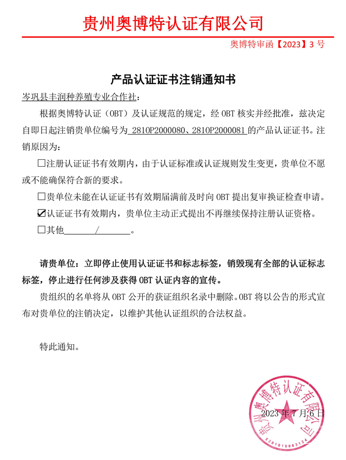 注銷岑鞏縣豐潤種養殖專業合作社產品認證證書通知